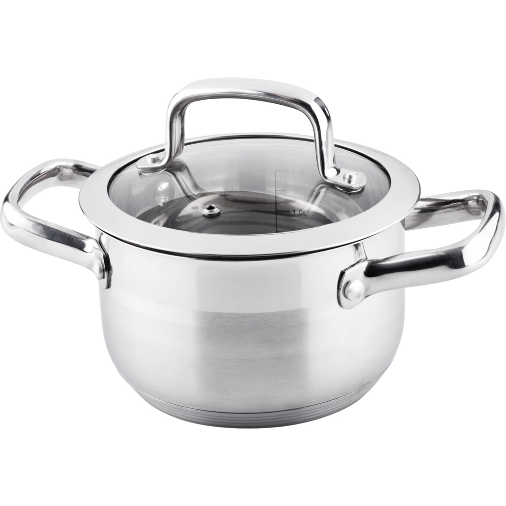 Fazék üveg fedővel, ø16x9,5cm; 1,8l - Prestige Csúcsminőségű nemesacélból készült edény Ellenálló üvegből készült fedő széles, nemesacél rámával Fedőbe épített gőzszelep a főzési folyamat precíz kontrollálásához Liter beosztás