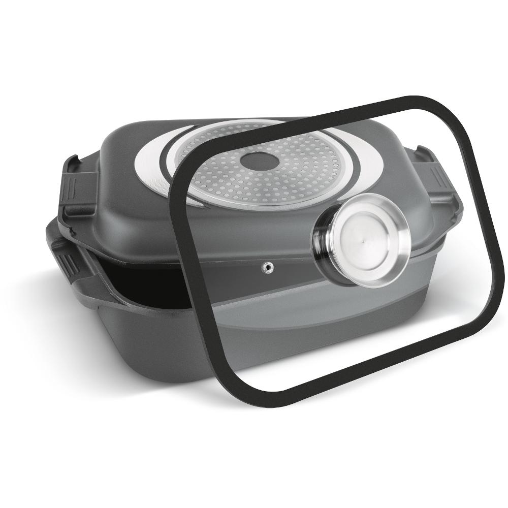 Minőségi öntött alumínium sütőedény, boroszilikát üvegből készült üvegfedél és grillező fedél, belső tapadásmentes felülettel, amely megakadályozza az étel odaégését, vastag talppal.