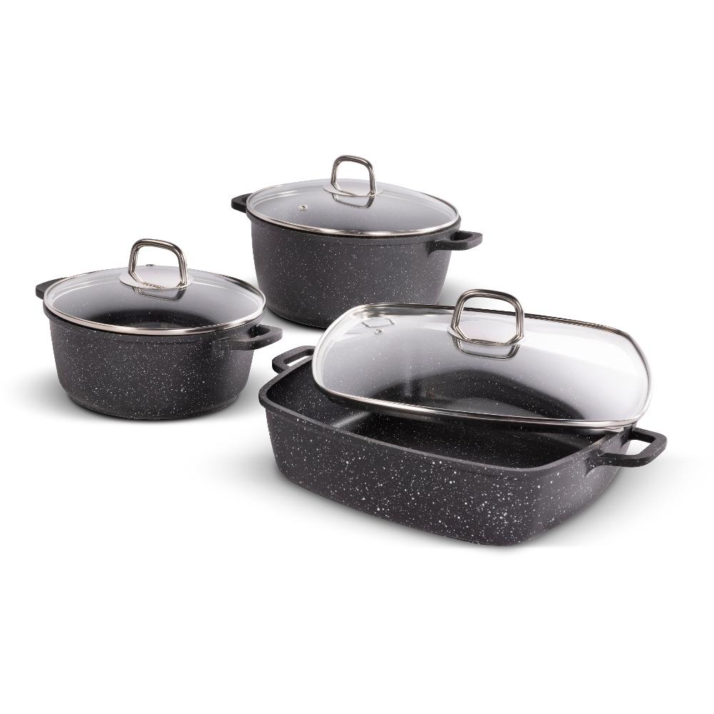 Edények tapadásmentes felülettel van ellátva, amely ellenáll a karcolásnak és az égésnek, vastag aljjal, nagyon elegáns fogantyúkkal a nagyobb biztonság, funkcionalitás és kényelem érdekében.