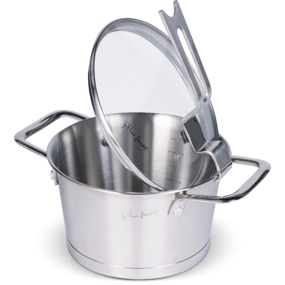 Nemesacél edény elsőosztályú rozsdamentes acélból, amelynek alja meg van erősítve és elegáns fülekkel rendelkezik a nagyobb biztonság, használhatóság és kényelem érdekében.