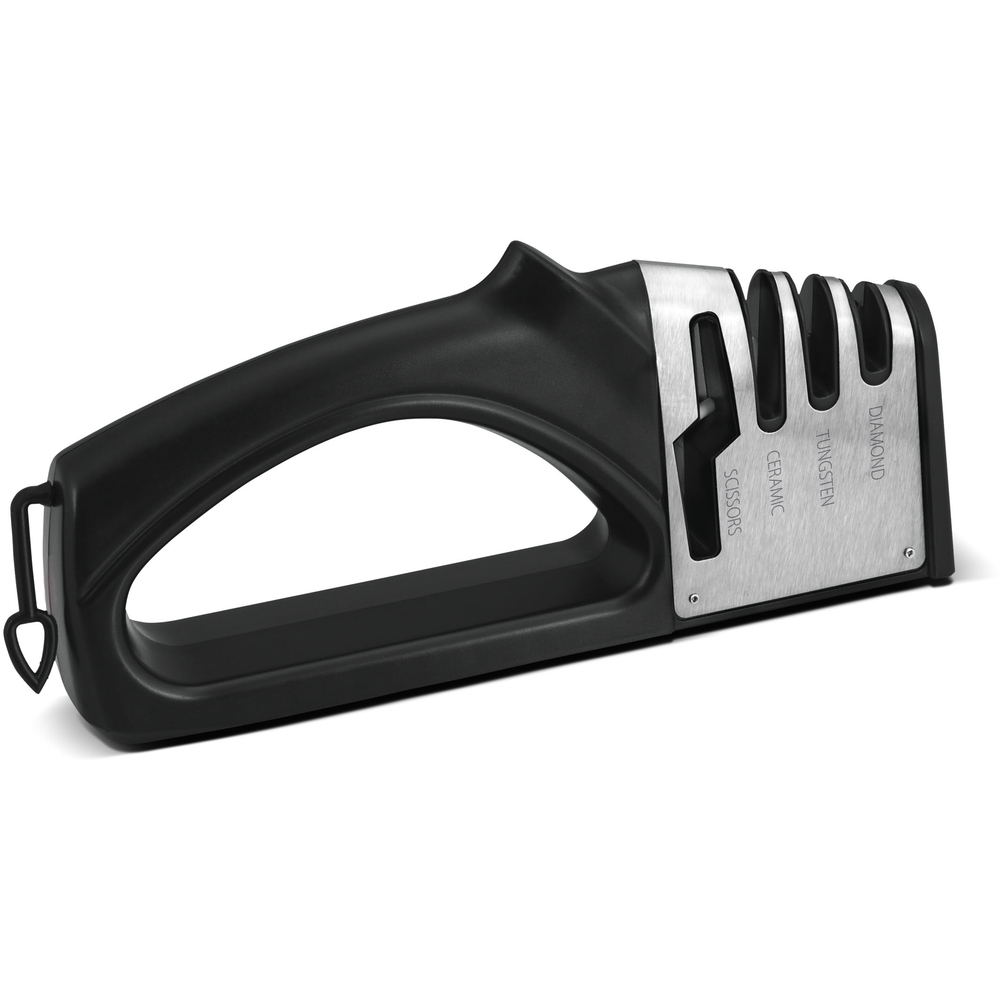 ABS műanyagból készült, soft kialakítású és csúszásgátló alapzattal ellátott háromfokozatú késélező és ollóélező.