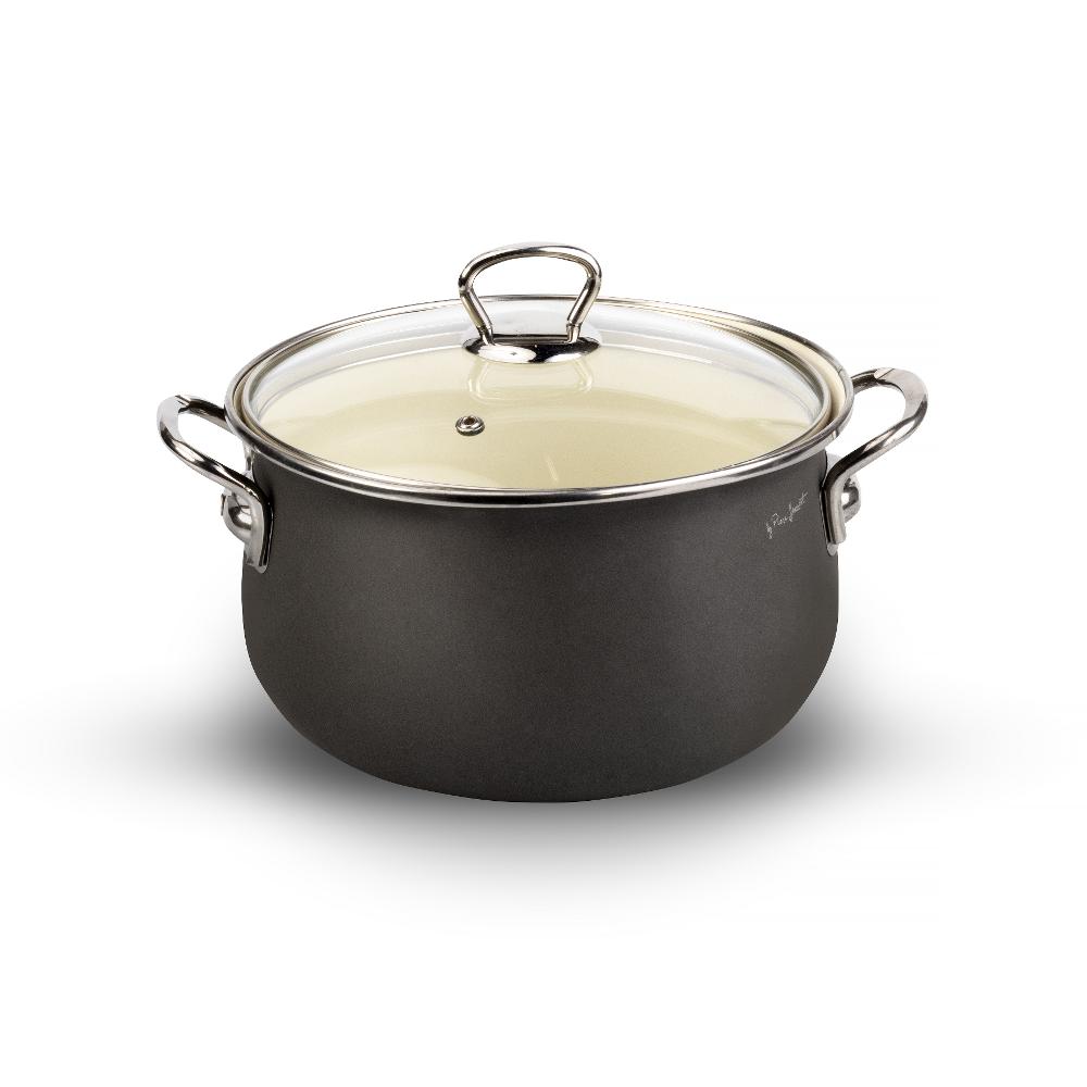 Ütésnek és leégésnek ellenálló zománcozott belső felülettel ellátott lábasok és serpenyők vastag aljjal és nagyon elegáns rozsdamentes acél vagy zománc fogantyúval.